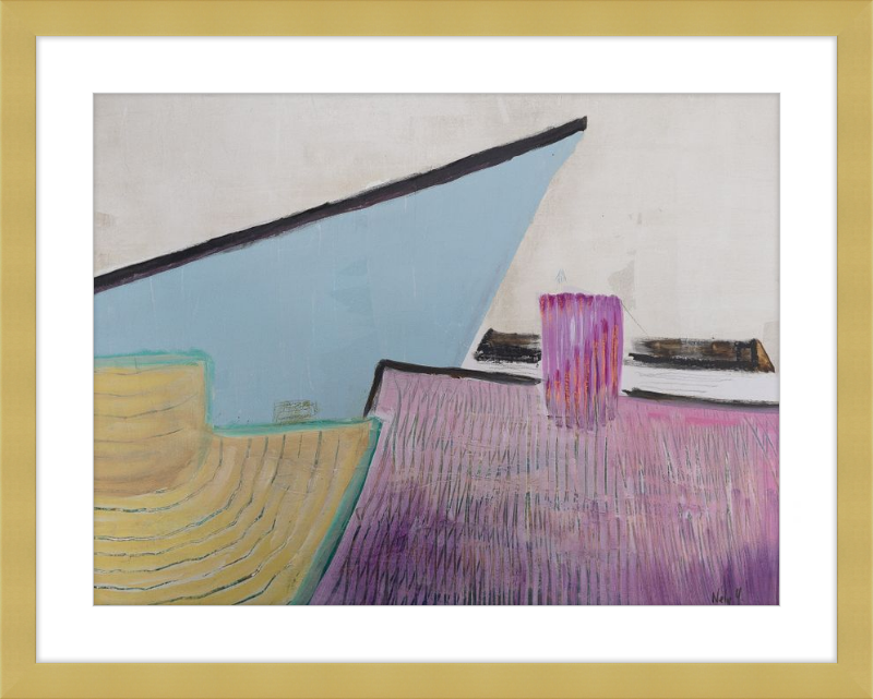 Elevate your decor with the Holiday Pink Art Print, a vibrant mix media artwork that features a dynamic interplay of shapes and colors. This piece showcases a striking blue triangle against a backdrop of muted tones, a bold section of purple with intricate linear patterns, and a soft yellow shape outlined in green. The texture and layering techniques create depth and movement, making it a captivating focal point in any space.